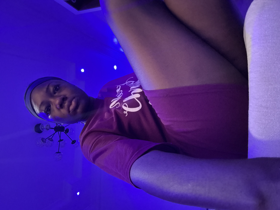 A person is angled downwards in a blue-lit room, wearing a burgundy t-shirt and a headband