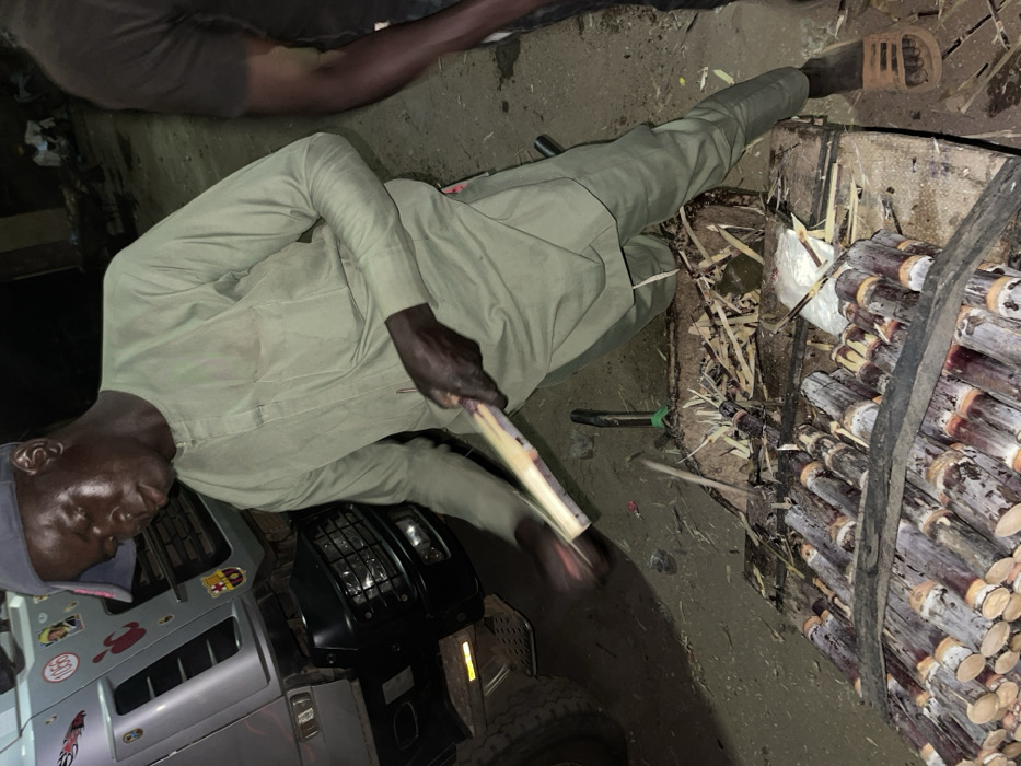 A man in light green clothing and sandals peels sugarcane next to a parked car. A basket piled high with sugarcane stalks sits to his right. A knife lies on the ground amidst sugarcane shavings. Part of another person's arm is visible in the upper left corner. The scene is illuminated, possibly at night, with the car's front section visible.