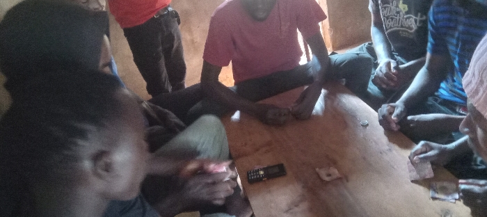 In the city of Getenga ward, Kenya, an indoor scene depicts approximately five individuals, primarily young men, gathered around a light-colored, possibly wooden, rectangular surface