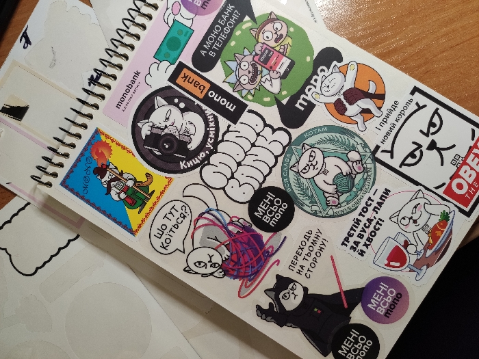 A white, spiral-bound notebook is positioned diagonally, resting on a light brown wooden surface. The notebook's cover is almost entirely obscured by numerous adhesive stickers. These stickers predominantly feature cartoon cats in various poses and costumes, with many incorporating the "Monobank" brand or related imagery. Key sticker details include: * A cat dressed as Darth Vader holding a pink lightsaber, with the Ukrainian text "ПЕРЕХОДЬ НА тьОМНУ СТОРОНУ!" (CROSS OVER TO THE DARK SIDE!). * A white cat tangled in pink and purple yarn, with a speech bubble reading "ШО ТУТ КОЇТЬСЯ?" (WHAT IS HAPPENING HERE?). * A stylized grumpy cat face with the text "ОБЕY THE CAT" and "І прийде новий король" (And a new king will come). * A sticker depicting a cat in Ukrainian Cossack attire against a blue and yellow background. * Multiple Monobank-branded stickers, including one with two cat-like figures resembling Rick and Morty holding a smartphone displaying the Monobank app, alongside the question "А моно банк В ТЕЛЕФОНІ?" (A monobank IN THE PHONE?). * A circular sticker with a cat holding a camera, text "КИЦЮ, УСМІХНИСЬ!" (KITTY, SMILE!). * A circular emblem-style sticker featuring a cat with yarn and the Ukrainian text "ВСЯ СЛАВА КОТАМ" (ALL GLORY TO CATS) and "NOVUS ORDO SECULORUM". * Stickers with phrases like "МЕНІ ВСЬО MONO" (I have everything MONO / I don't care about anything) and "ТРЕТІЙ ТОСТ – ЗА ВУСА, ЛАПИ Й ХВОСТ!" (THIRD TOAST – FOR WHISKERS, PAWS AND TAIL!). To the left of the notebook, partially visible, are white sheets of paper or sticker backing material. The specific location in the city of Unknown, Unknown cannot be determined from the visual evidence.