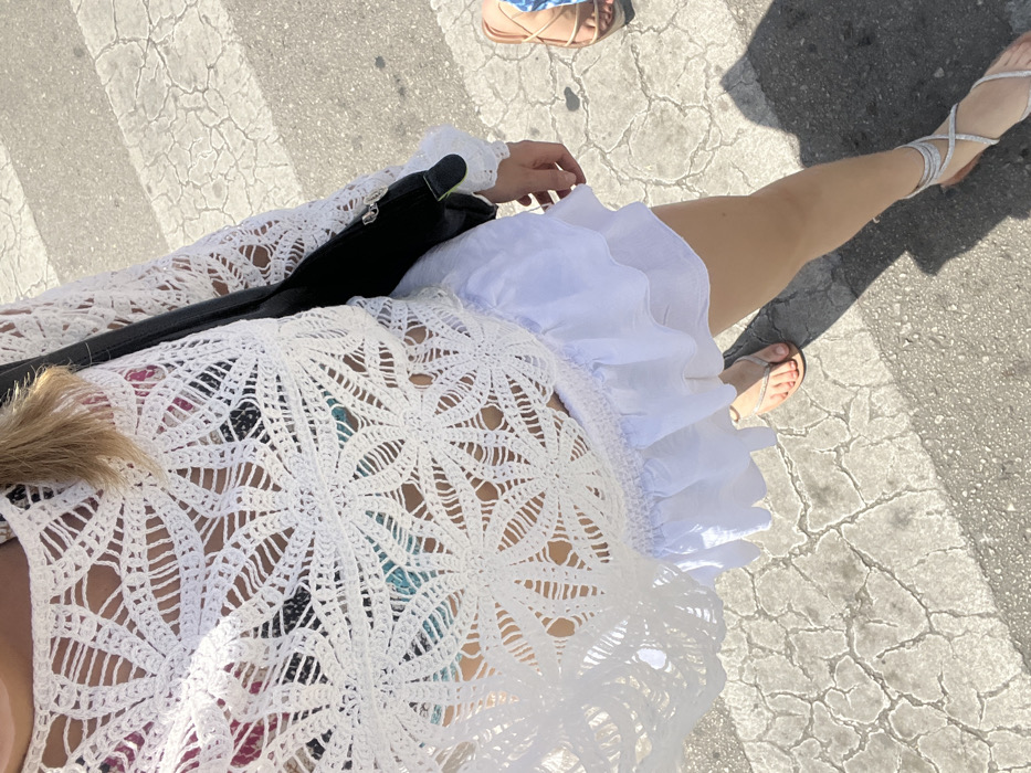 A woman stands on a crosswalk. She wears a white crocheted top over swimwear, paired with a frilly white mini skirt. Her footwear includes silver sandals. A black bag strap lies across her shoulder. A sliver of blonde hair is visible. Another person's feet in blue sandals are partially visible in the background. The textured pavement is brightly lit, casting shadows.