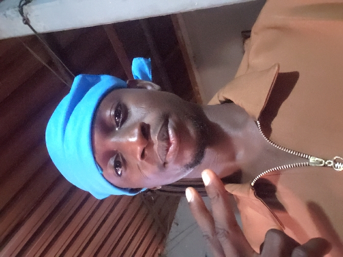 A person with dark skin, wearing a light blue head covering, looks into the camera. The individual has dark eyes and stubble on their chin. They are wearing a brown jacket that is partially unzipped, revealing a silver zipper. A hand with fingers extended in a peace sign is visible. The background appears to be an indoor space with varied lighting.