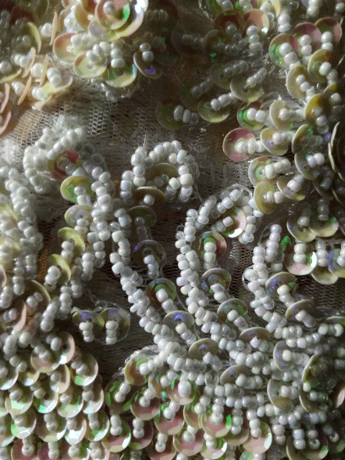 This image, located in the city of Phakeo, Laos, presents a detailed close-up of an ornate textile. The fabric is densely embellished with countless small, white, translucent seed beads, forming intricate, swirling, and organic patterns. Interspersed among the beadwork are numerous iridescent circular sequins, approximately 3-4mm in diameter, which reflect hues of green, pink, and yellow depending on the angle of light and illumination. The underlying material appears to be a fine, light-colored mesh or lace fabric, serving as a foundation for the hand-sewn embellishments. No individuals or specific actions are depicted; the scene exclusively focuses on the static, decorative textile.