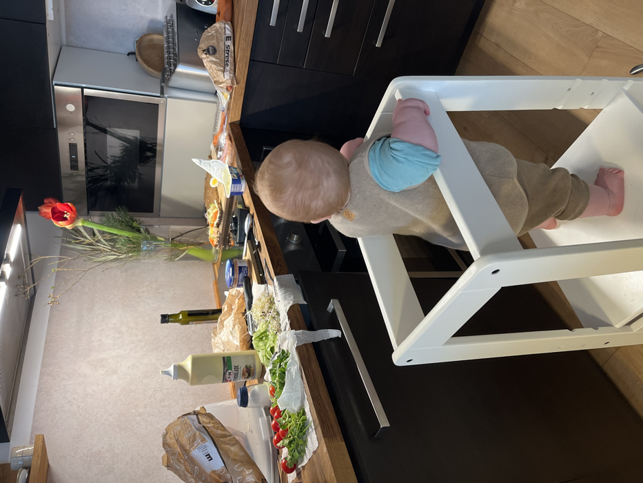 A kitchen in Waldgrehweiler, Germany, is depicted with an infant observing food preparation activities. The infant, viewed from behind, stands in a white wooden learning tower, positioned facing the kitchen counter. The infant wears a beige long-sleeved overall or sleeper, a light blue long-sleeved shirt underneath, and pink socks on its feet. The dark wood or laminate kitchen counter is covered with items. From the left, a brown paper bag rests on the counter. Next to it is a white plastic squeeze bottle of LPW Remoulade, followed by a small white salt shaker and a dark glass bottle of olive oil. Further right, a second brown paper bag is present. On white paper towels, a selection of fresh produce is arranged, including red cherry tomatoes on stems, green leafy vegetables, and sprouts. A wooden cutting board holds a dark-handled knife, a silver spoon, an open can of tuna, and a white container of spread with a blue lid. Several prepared open-faced sandwiches are also visible on the counter. A clear glass vase containing green branches and two prominent red tulips stands near the center. Behind the counter, a built-in stainless steel oven/microwave combination unit with a reflective door is visible. To the right of this appliance, a stainless steel toaster is present, alongside another brown paper bag. The kitchen features dark, possibly black, overhead and lower cabinetry with silver bar handles. The wall backsplash is a light, textured pattern. An overhead LED light strip illuminates the counter area. The floor is covered with a light wood or laminate material.