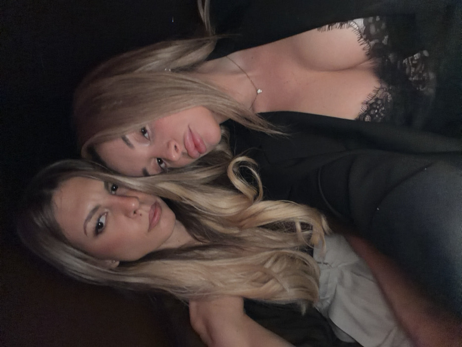 Two women, seen from above, pose intimately for a selfie. The woman in the foreground has blonde hair and a serious expression. The other woman rests her head near the first woman's hair and has a slightly pouty expression. Both have fair skin. The woman behind wears a black blazer over a lace top. The scene has low lighting.