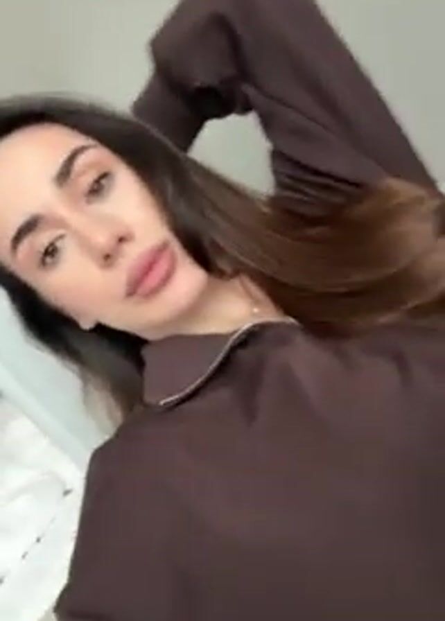 A woman lies on a light-colored couch