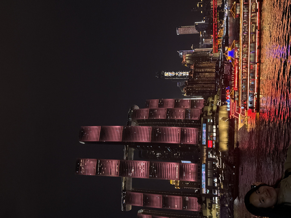 The image displays a nighttime cityscape and river scene, observed from Nan'an District, Chongqing, China. In the background, the Raffles City Chongqing complex dominates, showcasing eight high-rise towers, with four central ones extensively illuminated in pink light and connected by a prominent sky bridge. Numerous other high-rise buildings are visible across the urban landscape, illuminated with warm yellow and white lights, including one taller structure with vertical Chinese characters displayed on its facade. A red, illuminated bridge is present in the far right background. The midground features a wide river, likely the Yangtze or Jialing River, reflecting the vibrant artificial lights. A large, multi-deck pleasure boat, adorned with red, yellow, and blue lights and traditional Chinese architectural details on its upper decks, occupies the right side of the river. Passengers are visible through its windows. Several smaller, less illuminated boats are also present on the water, closer to the opposite bank. In the lower-left foreground, a female individual is partially visible from the chest up, facing the camera with a subtle smile. She wears a light-colored garment, and her right hand is raised near her face, possibly holding a device or gesturing. The sky is dark and clear, providing a stark contrast to the brightly lit urban environment.