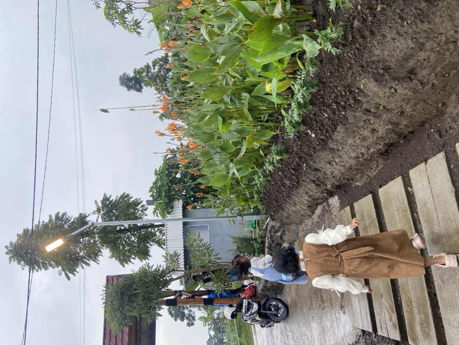 An outdoor scene in Trawas, Indonesia, is depicted under an overcast sky. A paved pathway composed of rectangular concrete slabs angles from the lower center toward the upper left. To the right of this path, a freshly dug earth trench borders a raised garden bed. This bed contains numerous tall plants with prominent green leaves and bright orange Canna lily flowers. Smaller green plants are newly planted along the front edge of the garden bed. A tall metal pole supporting an illuminated street lamp with an LED fixture is positioned left of center, with its light visibly glowing. Behind it, green trees and foliage are visible, along with a small, light gray building featuring a corrugated metal roof and a rectangular opening. Overhead, two black utility lines stretch across the frame. To the left of the concrete path, a wet asphalt or gravel road is present. A black scooter is parked on this road, partially obscured by a low retaining wall. Further left, a structure with a reddish-brown tiled roof is visible. Three individuals are in the scene. In the foreground, a young girl, seen from behind, walks on the concrete slab path. She wears a long-sleeved white top with ruffled cuffs and a brown, checkered sleeveless dress tied at the back, along with pink shoes. A second young girl, also seen from behind and to the side, stands on the asphalt road to the left of the path, wearing a light blue overall dress over a white top. Two adult figures are partially visible in the background near the parked scooter and the tiled roof structure.