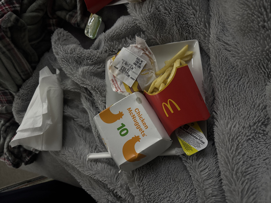 A messy scene presents McDonald's takeout on a fluffy gray blanket