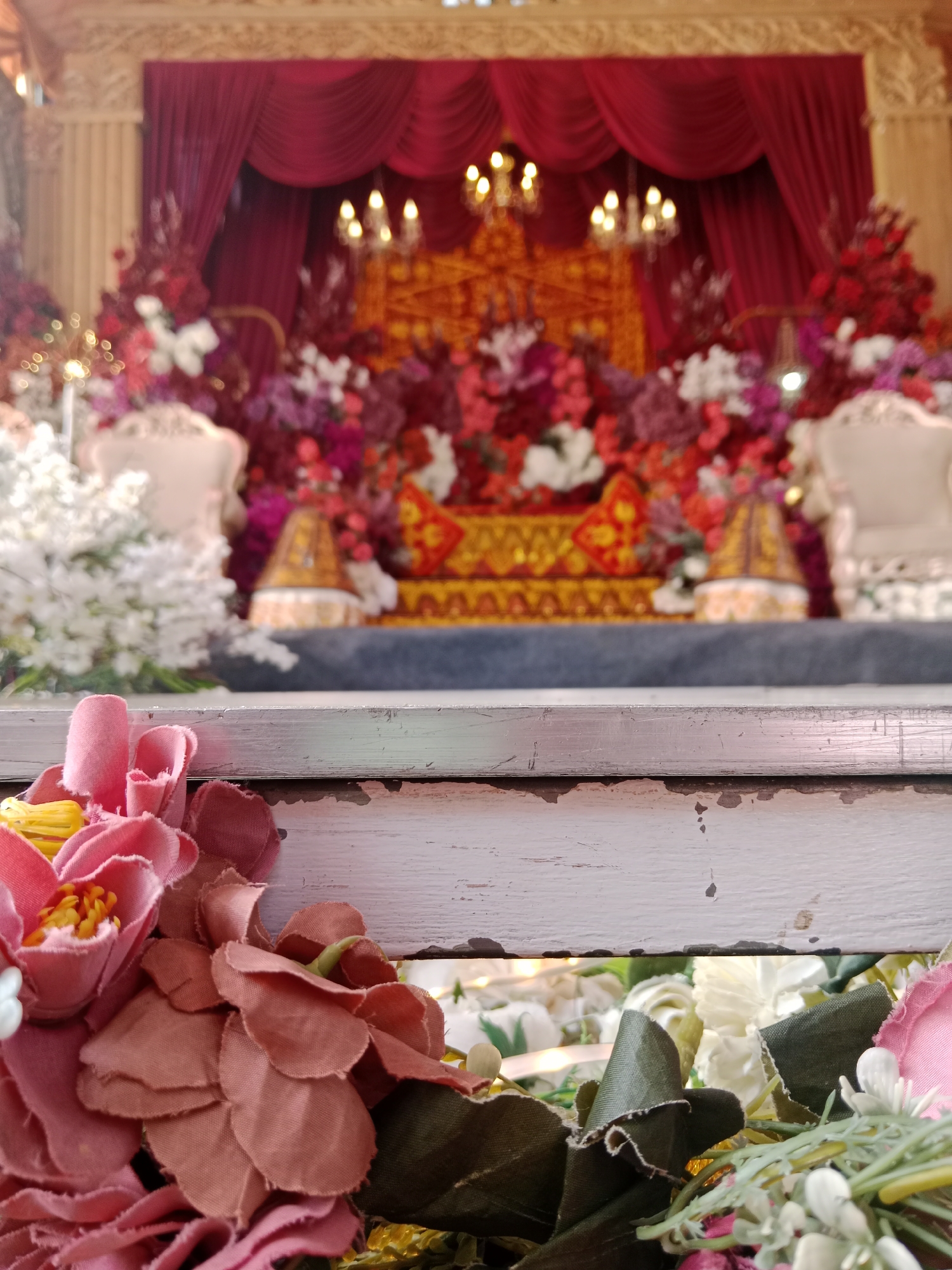 decorated stage, possibly for a wedding or other ceremonial event, in Gampongjawa, Indonesia. The stage has a red and gold backdrop with draped curtains and chandeliers. There are floral arrangements of red, white, and pink flowers on and around the stage. In the foreground, there are additional floral decorations including pink and brown flowers placed around a white, wooden structure. Two ornate chairs are visible on the stage.