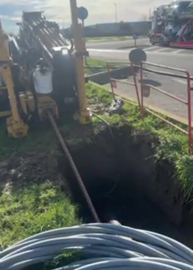 yellow drilling machine next to a rectangular hole in the ground. A long pipe is entering the hole, presumably being drilled underground. Coiled gray cables are visible in the foreground. A street and traffic can be seen in the background.