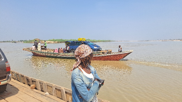 The scene depicts a river crossing operation in Ibi, Nigeria, under a clear, light blue sky
