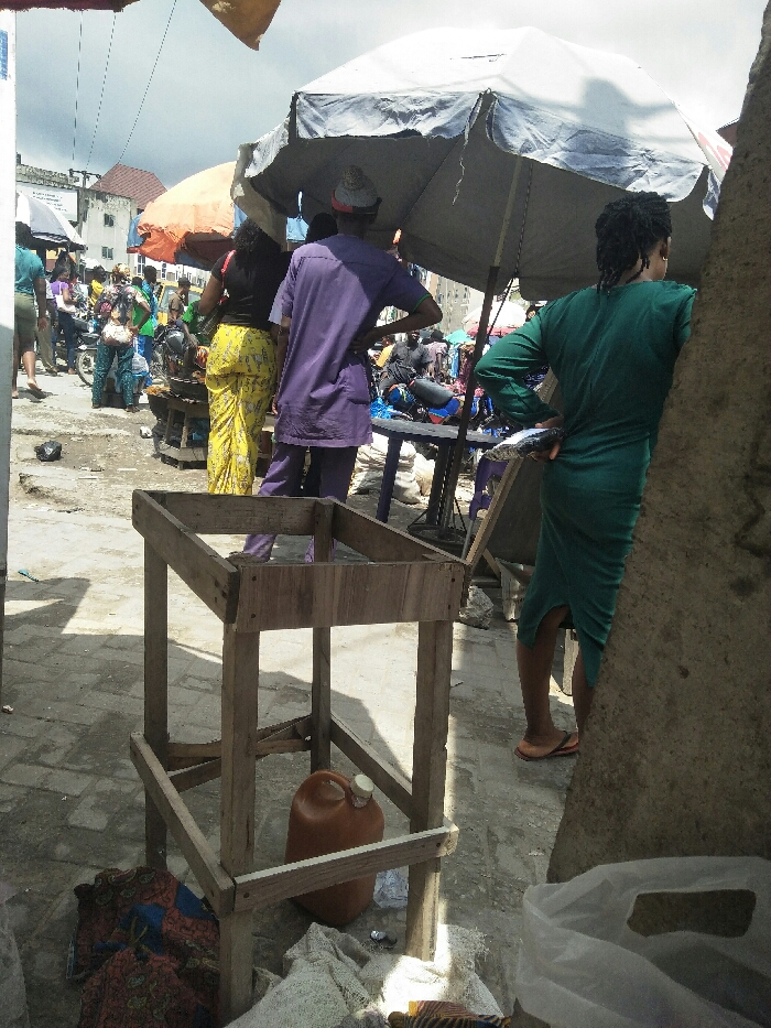 This image depicts a bustling outdoor market scene in Satellite Town, Nigeria, under a partially overcast sky. In the immediate foreground, a roughly constructed wooden frame, appearing to be a market stall or stand, dominates the left side. Beneath it, an orange plastic jerrycan with a white cap rests on the ground, alongside fabric bundles and miscellaneous debris. To the far right, a light-colored, rough-textured wall or pillar obscures part of the view. The midground features several individuals. A person in a long-sleeved green dress and orange flip-flops stands with their back mostly to the viewer, leaning against the aforementioned pillar on the right, holding a small, dark object. To their left, a person in a purple agbada-style outfit and a light-colored cap stands with hands on hips, facing away from the camera. Another person, partially visible to the left of the purple-clad individual, wears a yellow patterned skirt and a dark top. Large, worn market umbrellas, one grey and one orange, provide shade over various stalls and activities. The background is densely populated with people, indicating a busy thoroughfare or market area. Motorbikes are visible among the crowd, and various market stalls with goods are discernible. Distant buildings, including multi-story structures, are visible under the horizon line, suggesting an urban setting. The ground is a mix of paved and unpaved surfaces, appearing worn and dusty.