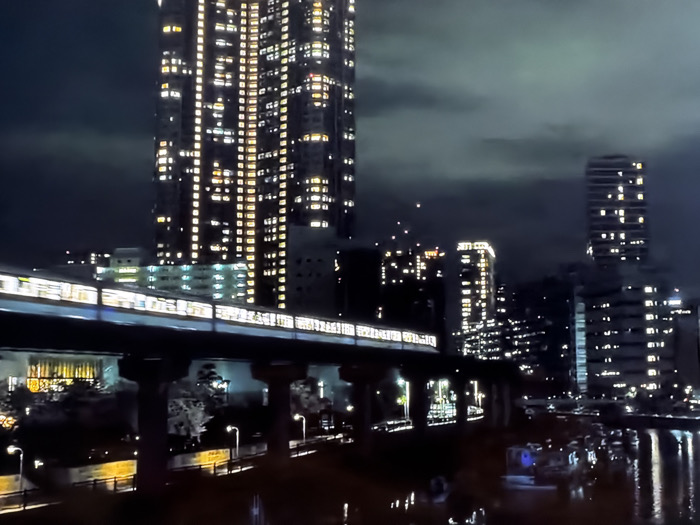 The image captures a night-time urban cityscape in the city of Huixquilucan de Degollado, Mexico. An elevated, multi-car train is in motion, traversing a raised track supported by dark, cylindrical pillars across the mid-ground. The train's illuminated windows appear as a bright, horizontal streak, indicating movement from left to right. Below the elevated structure, a dark body of water, consistent with a river or canal, reflects the surrounding urban illumination. Several small vessels or boats are visible on the water, some with minor lights. The adjacent riverbank features multiple illuminated streetlights and areas of dark foliage. The background is dominated by numerous high-rise buildings under a dark, cloudy sky. A prominent, very tall skyscraper on the left-center is extensively illuminated with numerous rectangular windows emitting a warm yellow-orange light. Additional multi-story buildings of varying heights, also lit, extend across the background, forming a dense urban panorama. No individuals are discernible.