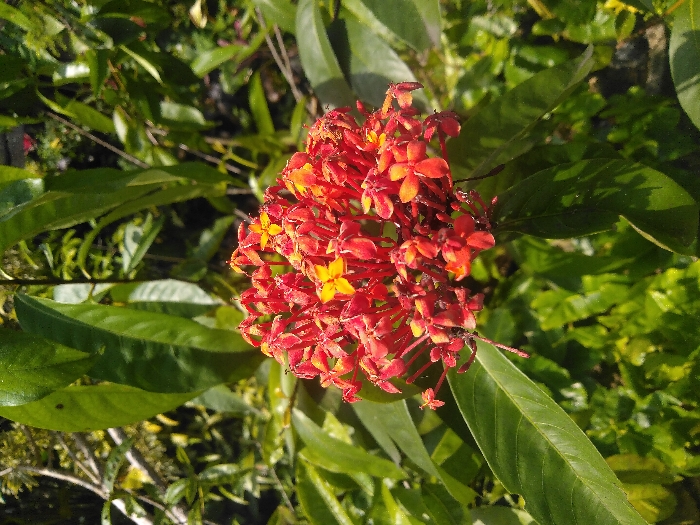 - "A close-up photograph captures a dense cluster of vibrant red and orange Ixora flowers, centrally positioned within a natural botanical environment" by FM-U14g83, licensed under CC BY 4.0