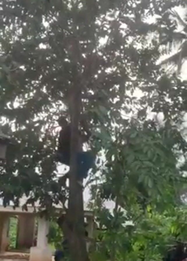 A man is climbing a tree. The man is wearing dark clothes and blue jeans. The tree has a thick trunk and green leaves. There is a building in the background. The sky is overcast.