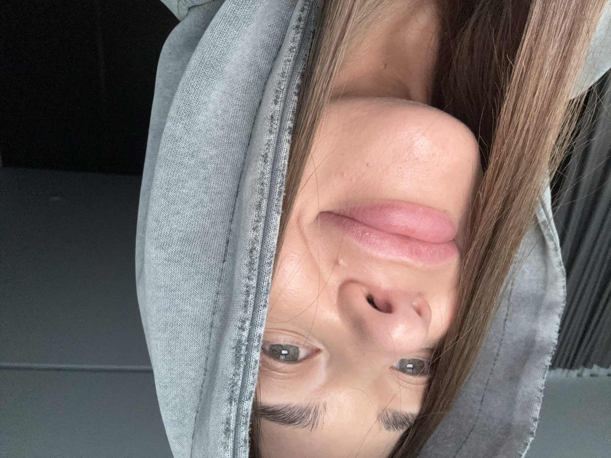 A close-up selfie of a woman with light brown hair wearing a grey hoodie