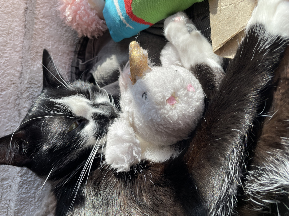 A domestic short-haired tuxedo cat, predominantly black with distinct white markings on its face, chest, and front paws, is observed in a reclined position. The cat's left eye is partially open, displaying a green iris, while its right eye is mostly closed, indicative of rest. Prominent white whiskers extend from its snout. The cat is holding a small, white, plush unicorn toy, which features a golden horn and subtle pink facial details, against its chest with its forepaws. The animal rests on a dark grey fabric surface. In the background, to the upper right, a light pink textured spherical object is present, adjacent to a fragment of a multi-colored fabric item displaying blue, green, and red stripes. A small piece of light brown, crinkled paper or cardboard is partially visible at the bottom right of the frame. Strong, directional natural light illuminates the scene, creating distinct highlights on the cat's fur and shadows on the objects. This scene is situated in San Sebastián de Aparicio, Mexico.