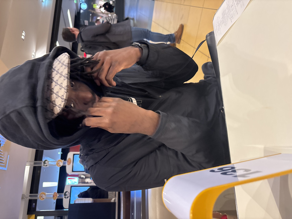 The image displays an interior scene within a McDonald's restaurant located in Strasbourg, France. In the foreground, a person with dark skin is seated at a white table. This individual wears a black hooded jacket with the hood pulled up, partially obscuring their face. A patterned flat cap is visible beneath the hood, and dark dreadlocks or braids are present. Both hands are raised, with fingers near the sides of the face and hood, possibly adjusting the attire. A dark watch is worn on the left wrist. On the table, a white and yellow table number stand displaying the number "126" is visible on the left, and a white paper receipt lies on the right. In the middle ground, to the right of the seated person, a man with light skin, wearing a dark jacket, blue jeans, and brown shoes, walks away from the viewer while carrying a black backpack. The background features several self-service order kiosks with prominent screens and a bright, well-lit environment characteristic of a fast-food outlet.