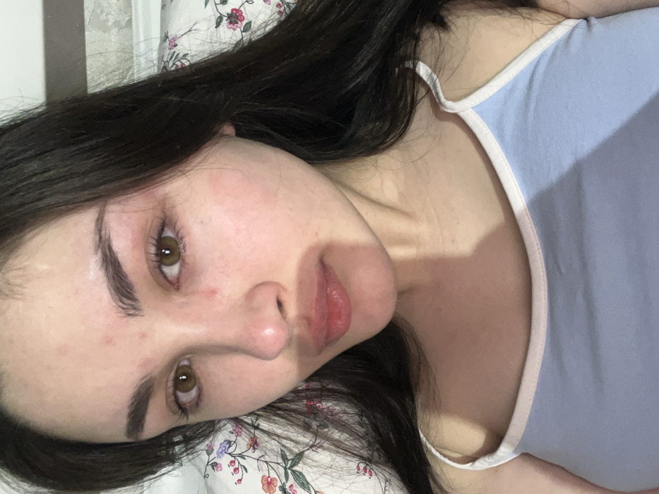 A young woman with olive skin, full lips, and dark hair lies on a floral patterned bed. She wears a light blue tank top with white trim. Her brown eyes are open and looking towards the viewer. Light reflects off her skin, accentuating natural shadows. Her dark eyebrows are prominent above her eyes. The angle is from above and slightly to the side.