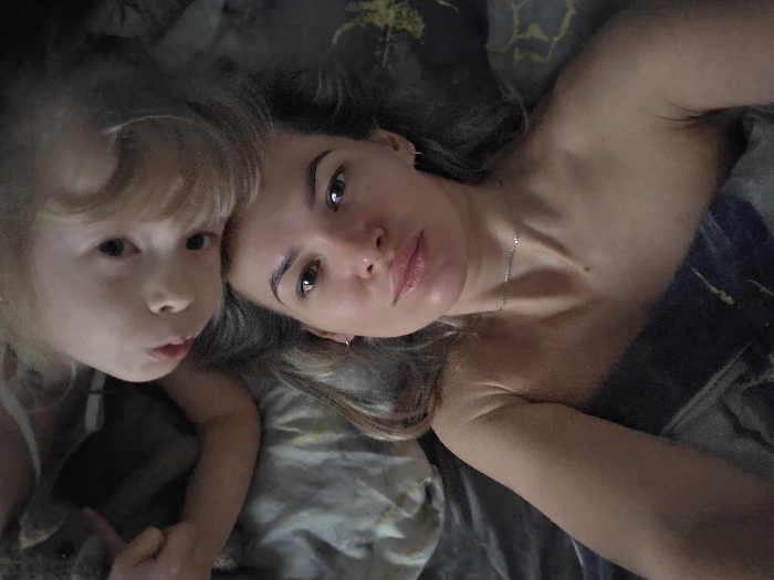 - "An overhead photograph captures an adult female and a young child lying on patterned bedding" by FM-90THh1, licensed under CC BY 4.0