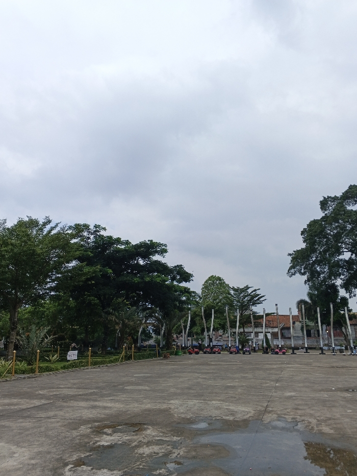 A wide-angle, eye-level exterior photograph depicts a large, empty paved plaza or square within Công viên 23 tháng 9 (September 23rd Park) in Ho Chi Minh City, Vietnam, on an overcast day. The upper two-thirds of the frame are dominated by a uniformly light grey sky. The lower third features a concrete ground surface with multiple wet patches and reflective puddles, indicating recent rain. To the left, a lush green border separates the paved area from a garden, composed of dense mature trees and foliage. A decorative golden-colored fence, consisting of short posts and rails, runs along this border, with a small white sign bearing indistinct black text attached to it. In the mid-ground, a row of approximately eight to ten brightly colored (red, blue, pink) child-sized electric ride-on cars is parked neatly on the paved surface. Behind these vehicles and extending further right, a series of tall, slender, light-colored vertical structures, possibly decorative pillars or stylized trees, stand prominently. Beyond these structures, distant buildings with reddish-brown tiled roofs are visible. No individuals are present in the immediate foreground or mid-ground, and the scene appears still, characteristic of a public recreational area.