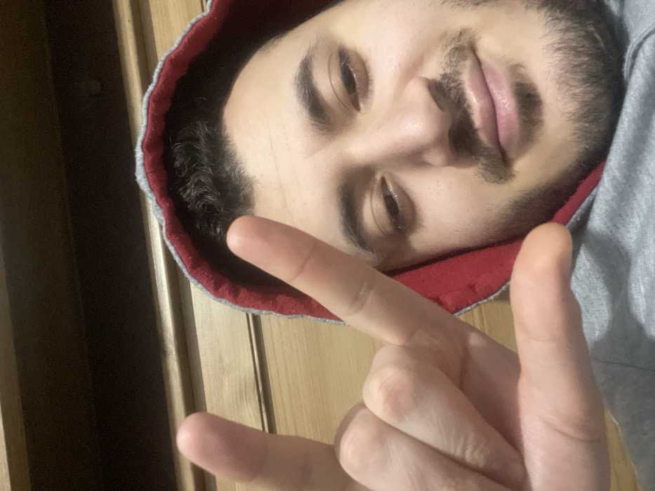 A person lies on their side wearing a gray hoodie with a red lining. They make a hand gesture extending the index and pinky fingers, possibly symbolizing the "rock on" sign. The person has brown hair, eyes, and a beard. The background shows a light-colored wooden surface. The lighting suggests an indoor environment.