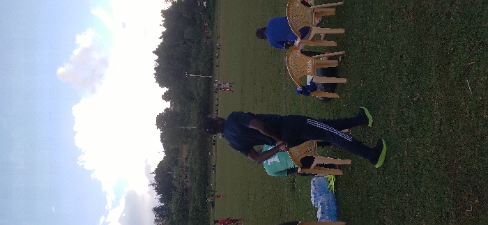 An outdoor scene features people sitting on plastic chairs near a green field. A person in dark clothing and bright green shoes is clearly visible, while others are more distant. In the background, a line of trees is visible. The sky is partly cloudy with a mix of blue and white. The image appears to be taken during the day.