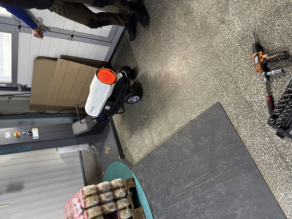 The scene is an interior view of an industrial or storage facility located in the city of Septemvri, Bulgaria. The floor is a light grey terrazzo with dark speckles. In the foreground, an open black tool case holds various socket wrenches, a ratchet, and an orange and black cordless drill. A dark grey, textured mat or ramp extends across the lower-left section of the floor. In the midground, a white TROTEC DH 30 industrial heater on a black wheeled cart faces left, with its heating element glowing red. To the right of the heater, the lower torso and legs of a person are visible; they wear dark blue sleeves, dark green pants, and black shoes, with their left hand on the silver handle of a white, paneled garage-style door. Several large, unfolded cardboard sheets lean against this door in the background. On the left side of the image, an "EVO" brand grey automatic pallet stretch wrap machine stands on a green rotating platform. A roll of clear plastic film is positioned on the machine. Adjacent to the machine, a wooden pallet is stacked with numerous clear plastic bags, each containing a light-colored granular product, collectively wrapped in clear plastic film. The wall behind the pallet and machine is constructed from white corrugated metal panels.