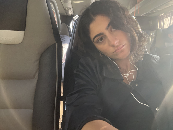 A female individual with dark, wavy, shoulder-length hair and an olive complexion is seated in a bus or coach, looking directly at the camera