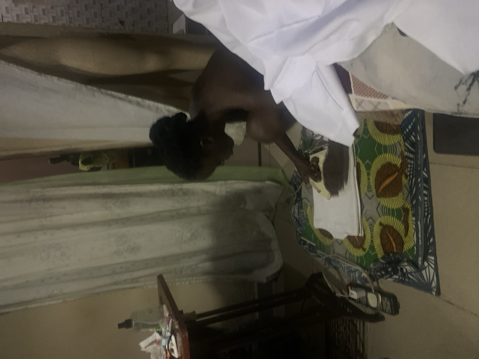 The scene depicts an indoor residential setting in Kafanchan A, Nigeria. A dark-skinned individual, appearing to be an adult female with braided hair styled in an updo, is observed in a crouching position on a light-colored tiled floor. She is actively engaged in ironing a folded white garment with a white electric iron held in her right hand. The ironing surface is composed of a colorful, patterned fabric mat, layered over another patterned mat on the floor. To the left, a dark wooden table is visible, holding a clear spray bottle, small containers, and miscellaneous items. A black remote control lies on the floor near the table. In the background, light-colored curtains with a subtle pattern are drawn. A pile of white fabric is partially visible on the right side of the frame. The room is dimly lit.