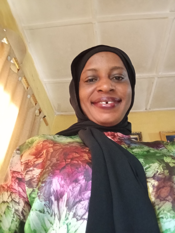 A woman wearing a black hijab and colorful, patterned shirt smiles at the camera