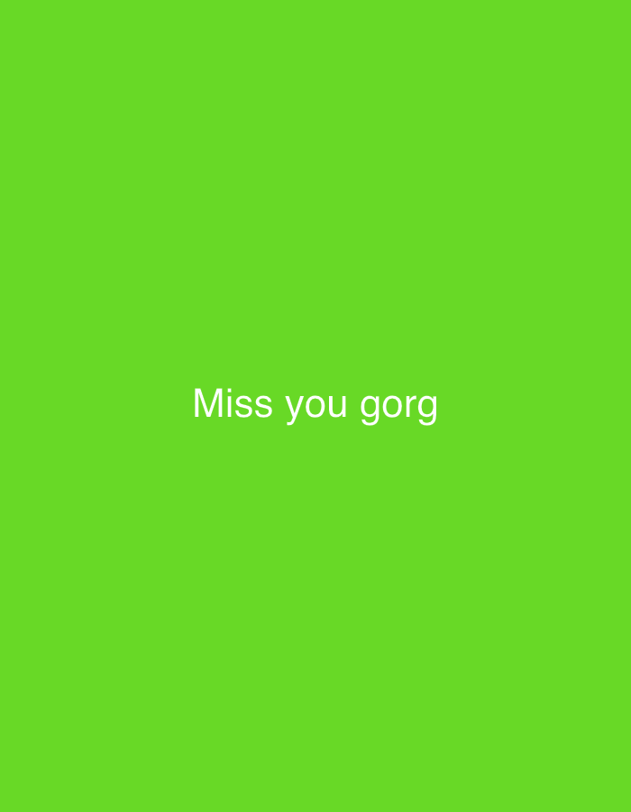 The image displays a solid lime green background. Centered on this background, white sans-serif text reads "Miss you gorg". No discernible people, subjects, objects, actions, interactions, or environmental features are visible in the image to determine a specific geographic location, including within the city of Tel-Aviv, Israel. The scene is devoid of any contextual elements that would indicate a physical environment.