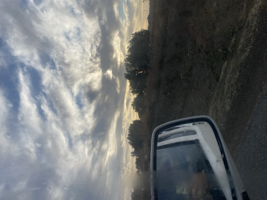 A vehicle's side mirror reflects a white vehicle as it moves along a roadside. The view outside includes a cloudy sky with wisps of cirrus formations, dark foliage bordering the road, and utility poles in the distance. The road is unpaved. The scene seems to be captured during the day.