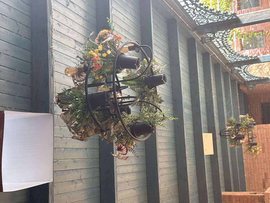 The image displays an interior or semi-outdoor space, likely a restaurant or cafe, situated in Uplistsikhe, Georgia. The ceiling is constructed from light blue wooden planks supported by darker blue wooden beams. A large, circular, dark metal chandelier hangs centrally, adorned with artificial green foliage, various colorful flowers, and multiple exposed filament light bulbs. Several small black planters containing artificial plants are integrated into the chandelier's design. A white rectangular fixture is partially visible on the ceiling in the upper left quadrant. Further into the background, a smaller, similarly constructed chandelier is suspended. A reddish-brown brick wall section is visible on the left side of the frame. To the right, a dark, intricately patterned decorative screen provides a partial view of external greenery and a distant brick structure. The scene is brightly lit. No individuals are depicted.