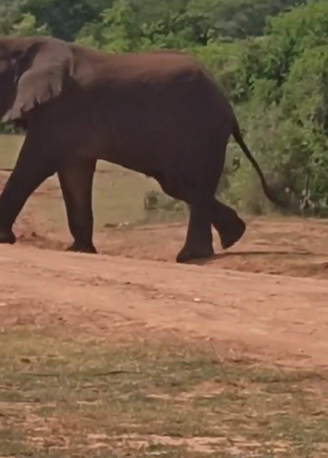 n elephant walking across a dirt road. The elephant is a dark brown color and appears to be of a medium size. It is walking from left to right in the frame, with its tail wagging slightly. The background consists of green trees and vegetation, with a hazy sky visible in the distance. The ground is a mix of dirt and some sparse green grass. The overall scene suggests a natural outdoor environment, possibly a safari or wildlife reserve.