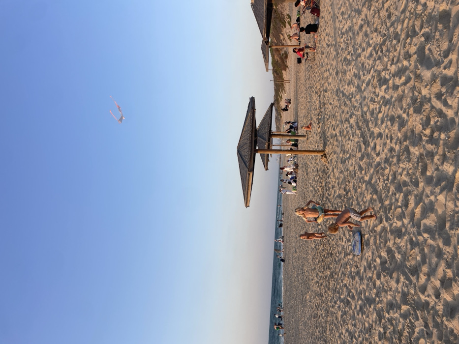 This image depicts a wide view of a sandy beach in Palmachim, Israel, under a clear, light blue sky