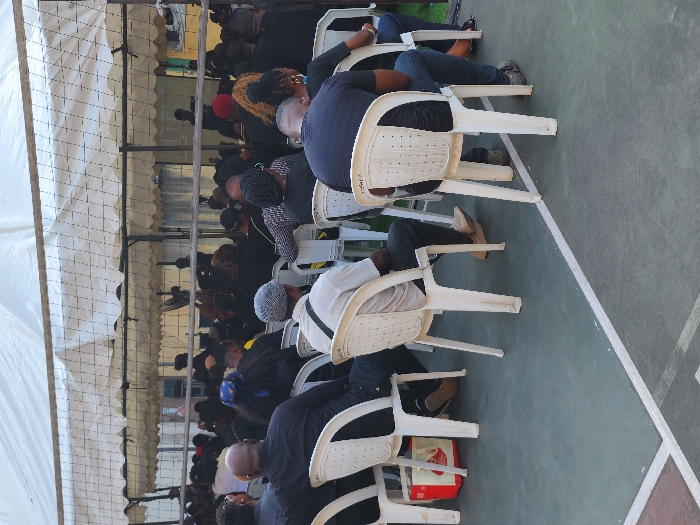 The image depicts an outdoor gathering in Iganmu, Nigeria, beneath a large white canopy tent supported by metal poles and a white netting framework. Numerous individuals, predominantly adults, are seated in rows on white plastic chairs, viewed from behind or the side. The vast majority of attendees are dressed in dark, primarily black, clothing. The ground is a green-grey paved surface marked with white lines, consistent with a sports court. Essential details include: - **People:** A crowd of individuals is seated, passively observing an unseen focal point. Specific individuals in the foreground exhibit various head coverings, including a blue patterned headwrap, a red cap, and a grey patterned flat cap. Footwear ranges from sandals to casual shoes. - **Subjects/Objects:** White plastic chairs provide seating. A red and white bag is visible on the ground next to a chair in the left foreground. Several ceiling fans are suspended from the tent structure in the middle distance. Metal support poles and netting are integral to the tent's construction. - **Actions/Interactions:** Individuals are seated, oriented in the same direction, suggesting they are attending an event or presentation. No direct interactions between individuals are discernible in this view. - **Environment:** The event occurs on a paved outdoor surface, likely a court, with residential or commercial buildings partially visible in the distant background beyond the tent's perimeter.