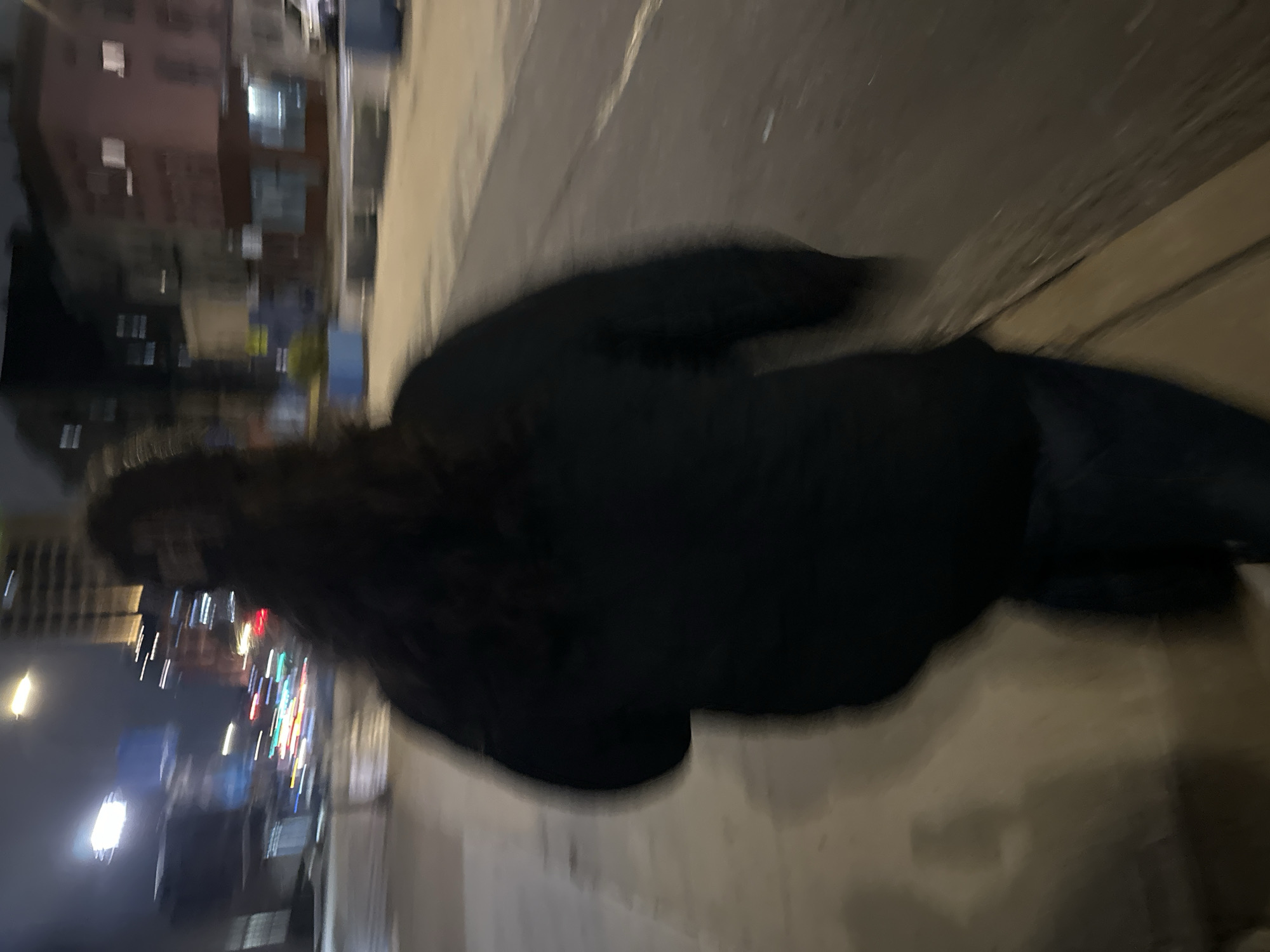 The image is a blurred, low-angle shot taken on a city street at night, likely in New York City. A person wearing a dark, puffy coat is walking on a sidewalk alongside a street. The background shows blurred city lights, possibly traffic and buildings. The sidewalk is likely concrete.