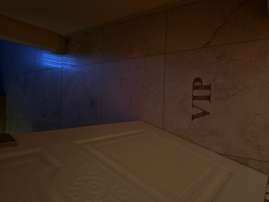 The scene depicts an indoor environment in Zlatograd, Bulgaria, looking through a partially open, light-colored wooden door into a corridor or room. The door, positioned on the left, features ornate raised panels with a decorative, embossed swirling motif. The floor is covered with light-toned, possibly marble or ceramic, square tiles exhibiting natural veining patterns. On one of these tiles in the foreground, the capitalized letters "VIP" are clearly visible in a dark, contrasting tone. The lighting is subdued, with a warm cast in the immediate vicinity of the doorway. Further down the visible tiled path, a distinct blue light illuminates the floor and reflects a vertical striped pattern, suggesting ambient light filtering through a window with blinds. A plain, light brown wall or door frame is visible on the right side of the image, bordering the tiled floor. No individuals or specific actions are observed.