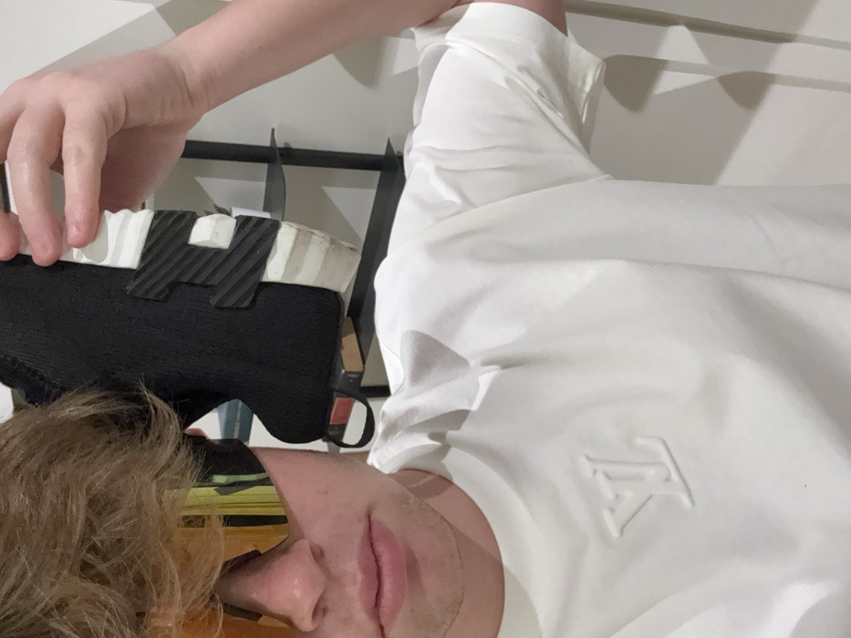 A close-up, waist-up portrait depicts an individual indoors in the city of Barcelona, Spain. The person has light brown hair and wears large, reflective orange-tinted shield sunglasses that obscure the upper face; only the lower nose and closed lips are visible. They are wearing a white short-sleeved t-shirt featuring a subtle embossed white "LV" (Louis Vuitton) logo on the left chest. The individual's right arm is bent, holding a black athletic shoe with a thick, multi-layered white and dark grey sole against the right side of their head, partially obscuring the temple and ear. The shoe's sole exhibits signs of dirt and wear. The background consists of a white wall, with a black metal open-shelf unit visible on the right, containing at least one book. The scene is illuminated by internal lighting.