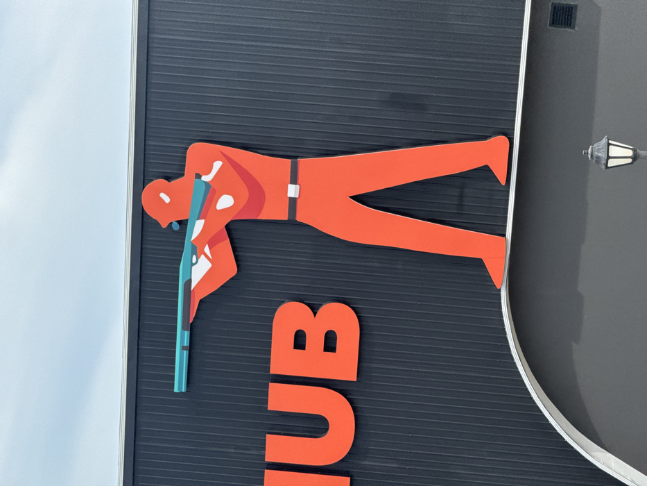 A side view of a sign with an orange figure holding a blue rifle is depicted. The person is positioned horizontally and leaning over, likely aiming the weapon. The figure has a belt with a white buckle. Below the figure are orange letters, with the top letters reading "UB". The background of the sign is a dark gray, horizontally lined texture. A white and gray border surrounds the sign. In the background, a white sky is visible on the left and a lamppost on the right.