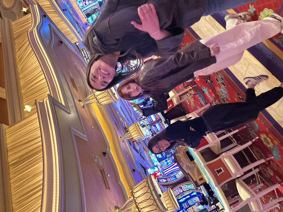 Three women pose in a casino. Two stand, while one sits. They wear casual clothing. The casino has ornate ceilings with recessed lighting and elaborate decorations. Slot machines line the background. Red, floral-patterned carpet covers the floor. Chairs are stacked in front of the slots. The perspective is skewed, as if the photo was taken tilting upwards.