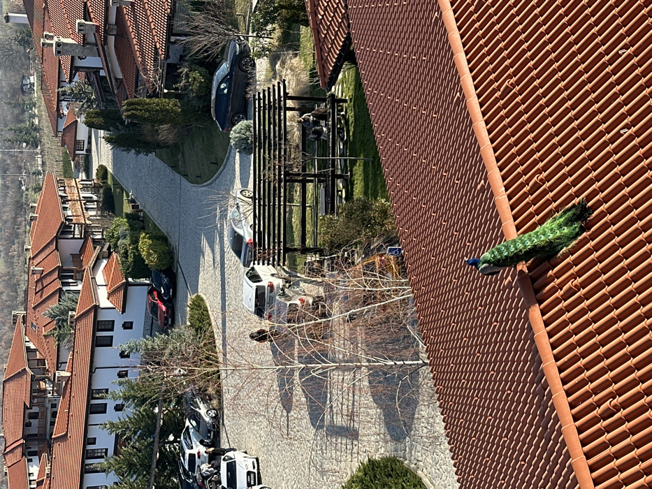 An elevated daytime photograph depicts a residential or resort complex in Krasnovo, Bulgaria. In the immediate foreground, a terracotta tiled roof is prominently featured, upon which a peacock is perched. The peacock faces away from the camera, displaying its iridescent blue-green plumage and long, vibrant green tail feathers trailing down the roof tiles. Below this roof, a cobbled driveway or parking area is visible. On the left side of the driveway, multiple vehicles are parked, including a white Audi SUV, a silver car, and a dark-colored vehicle. Towards the center of the driveway, two individuals are standing near the rear of a white SUV, one in dark clothing and the other in a lighter jacket, appearing to interact with the vehicle. To the right, a silver sedan and a dark SUV are situated on a paved road. A wooden pergola structure with benches and tables is located on a patch of green grass; two individuals are seated within this structure. The background consists of numerous multi-story buildings, characterized by white facades, dark wooden architectural elements, and red terracotta tile roofs, consistent with traditional Bulgarian architecture. These buildings are surrounded by various trees, including evergreens and some deciduous trees with bare branches, casting long shadows. Paved roads and pathways connect the buildings. Distant hills are visible on the horizon under a clear, light blue sky.
