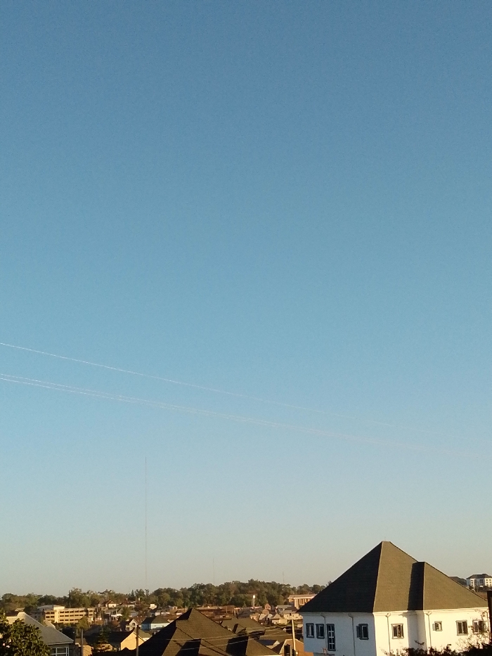 The image displays an elevated panoramic view of an urban landscape in Bukuru, Nigeria, under a clear, pale blue sky. The upper two-thirds of the frame are dominated by the sky, which transitions from a light blue at the zenith to a paler hue near the horizon. Two faint, parallel contrails are visible in the upper-left quadrant. A slender, dark vertical mast or antenna rises from the horizon line in the center-left portion of the frame. The lower third of the image reveals a dense cluster of buildings with various roof styles. A prominent white building with multiple rectangular windows and a distinctive dark, multi-faceted pyramidal roof occupies the bottom-right. To its left, numerous other structures with dark, pitched roofs are visible, interspersed with lighter-colored building facades. The distant horizon across the mid-section of the image shows a line of green foliage, indicating hills or elevated terrain beyond the built environment. No individuals, vehicles, or discernible actions are present within the scene. The lighting suggests a clear day.