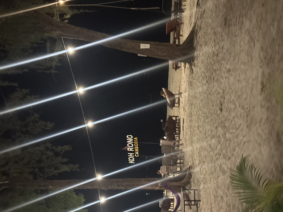 The image depicts a nighttime scene on a sandy beach, located at an establishment within the city of Preah Sihanouk, Cambodia
