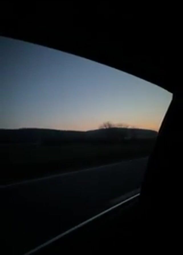 The video, shot from inside a car, shows a view from the car window moving along a road. Outside, silhouetted trees and rolling hills can be seen under a dusky sky. The road is marked with a white line. Two voices can be heard speaking in a language other than English.
