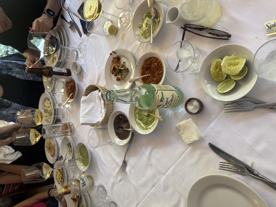 A table covered with a white tablecloth displays remnants of a meal. Several small plates hold various sauces, including red, green, and dark brown dips. There are also plates with lime wedges, sliced onions, and some food scraps. Numerous glasses, both empty and partially filled, surround the plates along with a beer bottle and an agua mineral bottle. A small bowl of salt and scattered silverware are also on the table. A wicker basket filled with white napkins sits towards the middle of the table.