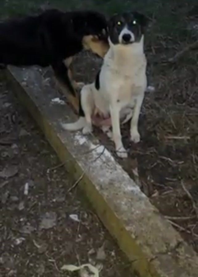 A medium shot shows a white and black dog sitting on bare ground next to a concrete block. Behind and to the left of the white and black dog, a black and tan dog stands, sniffing the white and black dog’s head and neck. Both dogs are facing to the right of the frame. The lighting suggests either dusk or dawn. The ground is covered with dead leaves and twigs.