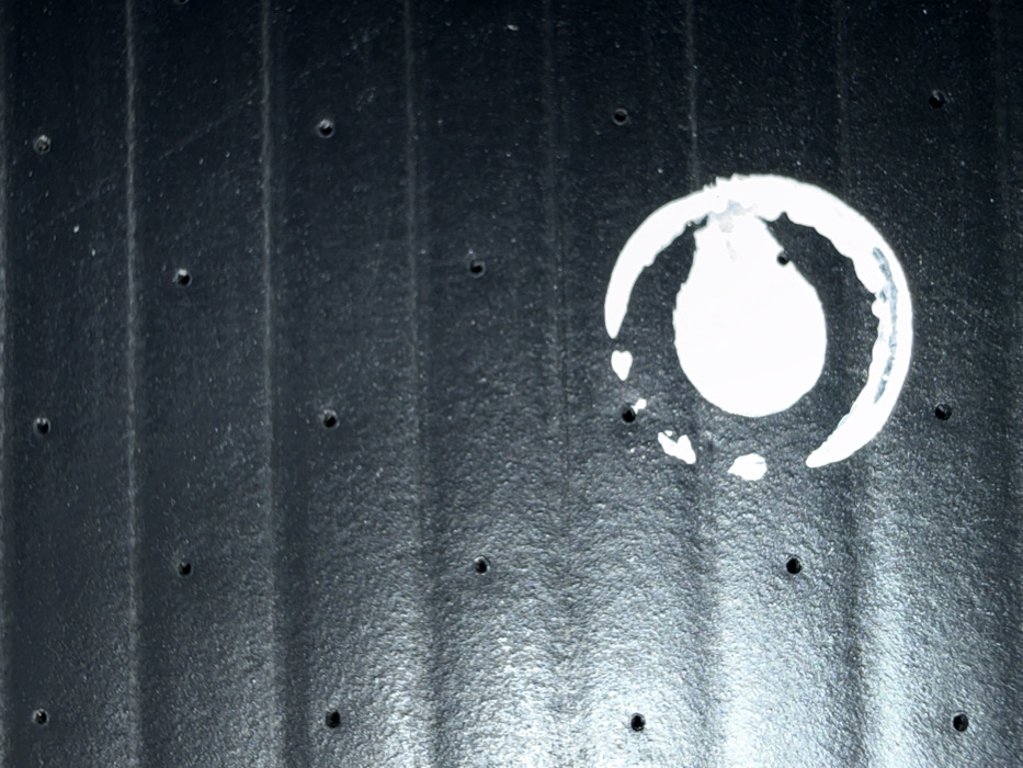 The image displays a dark, horizontally ridged manufactured surface, located in Maasdijk, Netherlands. The surface is textured with a granular appearance and contains numerous small, circular perforations uniformly arranged in a grid-like pattern. In the lower-central area, a prominent white mark is present, consisting of a solid, irregularly circular central deposit, partially encompassed by a distinct, thicker white crescent-shaped arc. Several smaller white splatter marks are visible proximal to the main white deposit. No individuals, direct actions, or interactions are observable within the frame. The visible environment is confined to this specific surface.